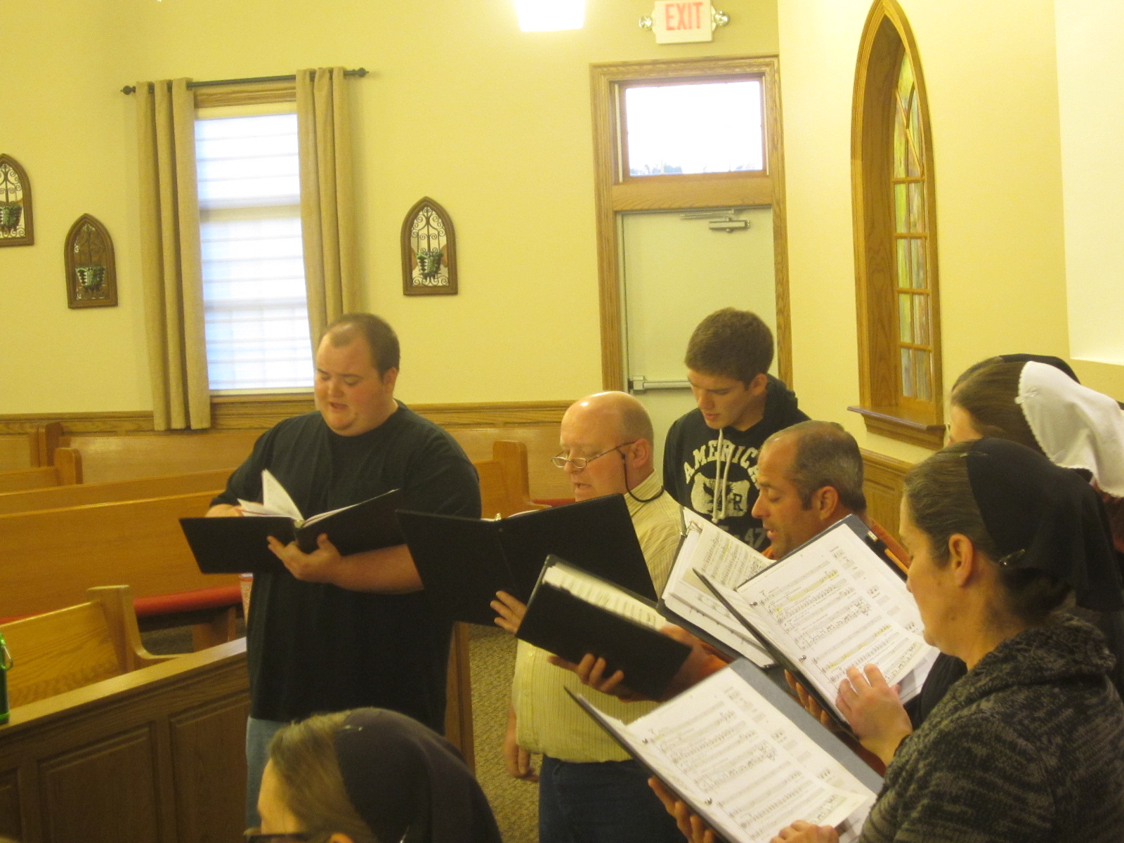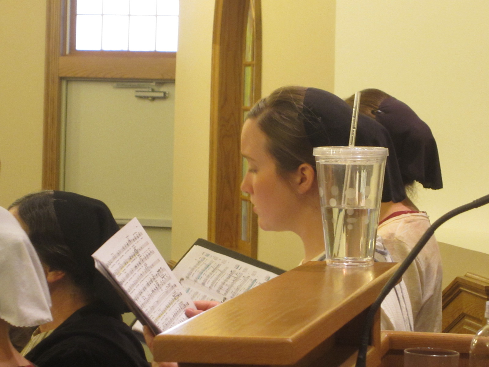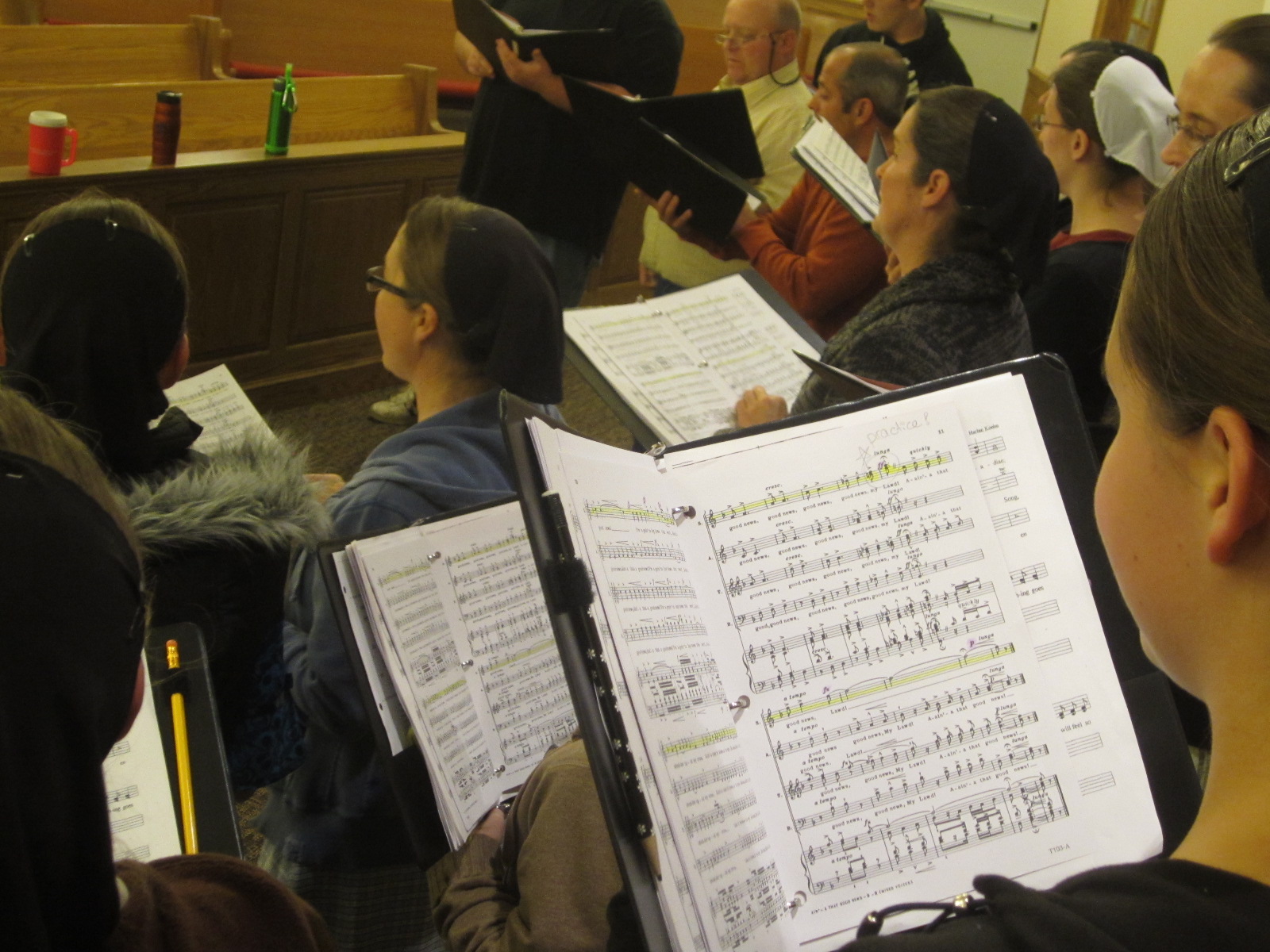The yellow light slants in the western windows, falling onto the backs of the heads of the tenors, throwing long shadows onto the brown benches. The basses, altos and sopranos circle up the stairs, their shirts and dresses blocks of color behind sheet music. The director stands in the middle, his elbows bobbing out the rhythm as his fingers play the choir like a virtual keyboard.